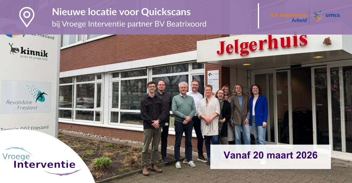 Vanaf 20 maart is het mogelijk om bij Revalidatie Friesland in Leeuwarden een multidisciplinair arbeidsonderzoek te laten uitvoeren: de QuickScan. De QuickScan is een multidisciplinair medisch onderzoek dat wordt ingezet als diagnostisch instrument. Het onderzoek biedt inzicht in de samenhang tussen gezondheid, belastbaarheid en werk en vormt de basis voor een onafhankelijk advies over arbeid […]
